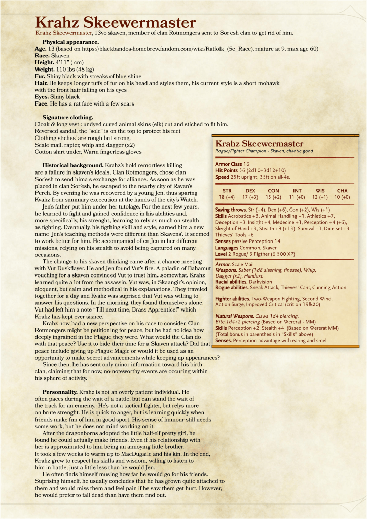 We made a ferw homebrew modifications. The Skavens needed to be bigger in our minds, Sig got modified rules for lycanthropy…among the few points. Anyway, not sharing this for the rule changes, sharing this for my writing of the backgrounds…I’m pretty happy about them, so were the players! (FYI: I just pulled them out of my hard-drive, didn’t reproof the typos or anything else!)