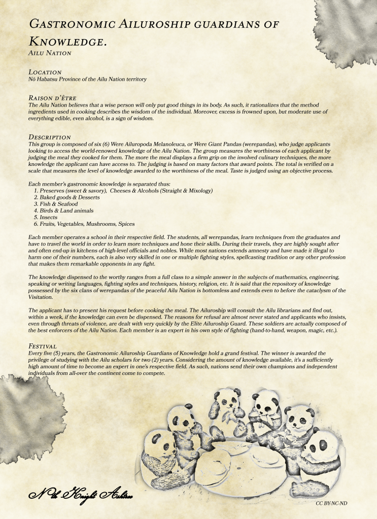 Anyway, the name of the group comes from the scientific name of pandas, Ailuropoda melanoleuca. The lore around it is something I’ve been toying with for a few months and I thought it would be a good writting practice.